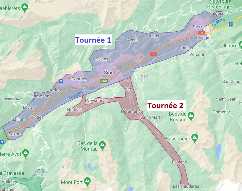Saxon, Riddes, Saillon, Leytron, Chamoson, St-Pierre-de-Clages, Ardon, Vétroz, Aproz, Conthey, Erde, Bramois, Sion, Champlan, Grimisuat, Savièse, Ayent, Arbaz, Saint-Léonard, Uvrier, Grône, Lens, Chalais, Chippis, Réchy, Sierre, Miège, Veyras, Salgesch, Basse-Nendaz, Nendaz, Haute-Nendaz et les villages aux alentours.