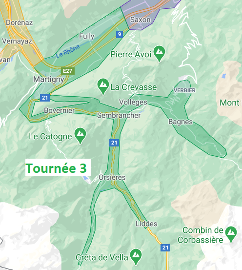 Fully, Charrat, Le Guercet, Martigny, Bovernier, Sembrancher, Les Valettes, Le Châble, Bruson, Bagnes, Cries, Vollèges, Levron, Versegères, Lourtier, Champsec, Verbier, Som-la-Proz, Reppaz, Praz-de-Fort, Orsières, Champex, La Douay et les villages aux alentours.