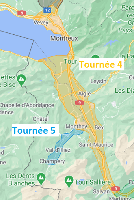 Troistorrents, Val d’Illiez, Vernayaz, Dorénaz, Evionnaz, Saint-Maurice, Lavey, Monthey, Massongex, Collombey, Collombey-Muraz, Vionnaz, Vouvry, Le Bouveret et les villages aux alentours.