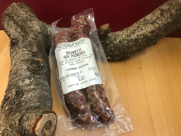 Salametti aux poireauxCHF6.00 Ingrédients: Viande de boeuf, de porc, lard, sel nitrite pour saumure E250, épices Rupture de stock Catégorie : saucisse ,jambon,lard,viande sèchee Description Description Produits apparentés Saucisse Bison nature CHF10.50 Ajouter au panier Lard sec (entre 200 – 230 gr) CHF9.70 Ajouter au panier Lard sec (entre 275 – 300 gr) CHF12.70 Ajouter au panier Viande séchée de bœuf « Au fumoir paysan » (entre. 195-230 gr) CHF17.95 Ajouter au panier