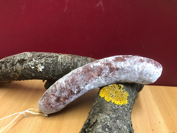 Ingrédients: sel nitrite, Dextrose (maïs), Antioxydant E301, poivres, ail, Boyau de boeuf, farine de riz.