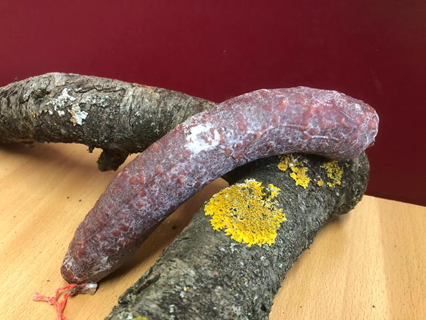 Ingrédients: sel nitrite, Dextrose (maïs), Antioxydant E301, poivres, macis (fleur de muscade), épices, herbes, ail, Boyau de boeuf, farine de riz.